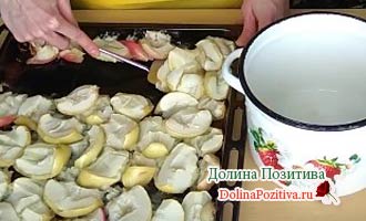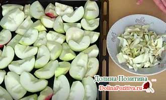 На лист деко викладаємо фруктові скибочки. Випікаються яблучка 30 хвилин. Змащувати деко рослинним маслом не треба.