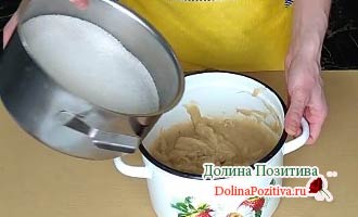 У пюре відправляємо 1 кілограм цукру. Перемішуємо, ставимо майбутній десерт на вогонь.