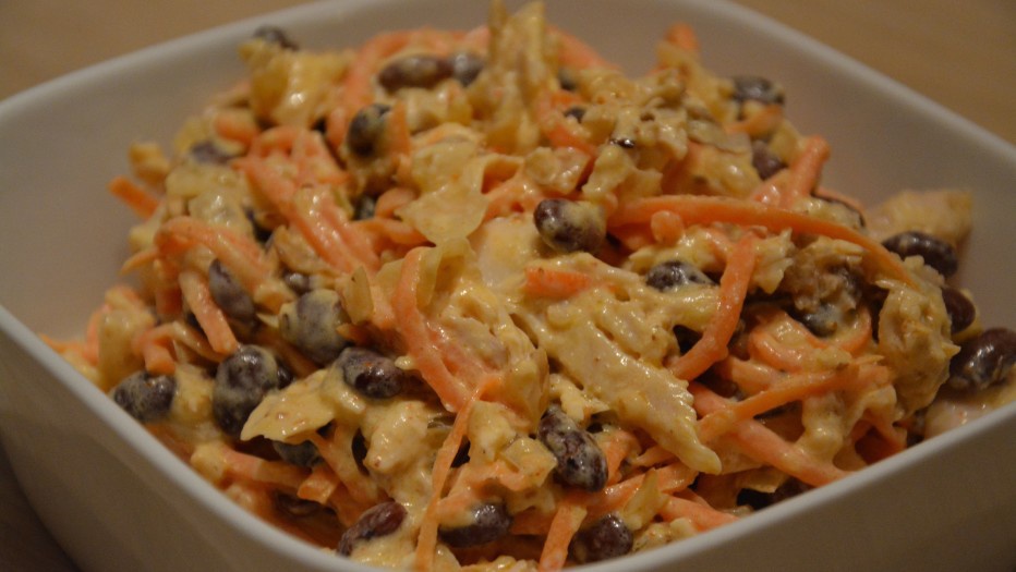 Варіант салату із стручкової квасолі, але доповнений курячим м’ясом. Від цього блюдо виходить дуже ситним і приємним на смак і ви можете бути впевненими, що воно сподобається всім сидячим за столом.