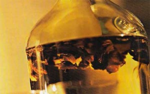 Технологія приготування з самогону домашнього коньяку неймовірно проста. Для початку дистилят нагрівають до кімнатної температури і всипають в нього марганцівку. Слідом в ємність відправляють гвоздику, горіхові перегородки, чай. Добре розмішують складу.