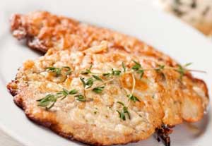 Додамо трохи екзотики: кунжут. Його додаємо в борошно — отримуємо якийсь вишуканий аналог панірувальних сухарів. М’ясо солимо-перчимо, занурюємо спочатку в яйце, потім в суміш борошна і кунжуту і кладемо на сковорідку. Смажимо все ті ж 5-7 хвилин з кожного боку.