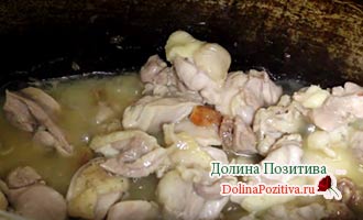 У казані спочатку розтопіть курячий жир. Потім додайте м’ясо. Трохи обсмажте, а потім тушкуйте на повільному вогні.