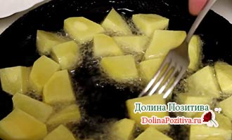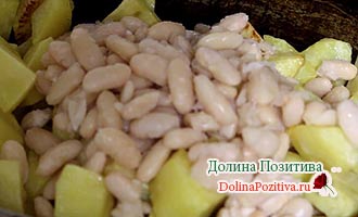 Заздалегідь зваріть квасолю. Або беріть консервовану. Картоплю, гарбуз наріжте середніми кубиками. У сковороді обсмажте картоплю до легкої скоринки.