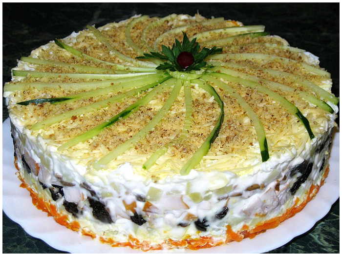 Візьміть тертку, на дрібній тертці подрібніть картопля, яйця, горіхи, моркву і сир. Потім перейдіть до копченої курки, з неї обов’язково треба зняти шкірку і порізати кубиками (поріжте акуратно). Чорнослив промийте під теплою водою і теж наріжте кубиками. Візьміть форму для випічки — кільце. Так форма салату вийде бездоганною. Подати салат на стіл, коли прийдуть гості, буде просто. Але, а якщо Ви хочете приготувати цей салат і Вам важливо встигнути в короткі терміни — можете не використовувати форму. Після того, як всі інгредієнти готові — переходьте до приготування. Салат викладається шарами (перший шар: чорнослив, курка, яйця, картоплю, а зверху сир, так наступні шари салату). Кожен шар тонко змащується майонезом. Останній шар притрушиваем посипаємо сиром і жовтком або горіхами. Якщо важлива подача страви на стіл — можете взяти огірок і красиво прикрасити верх салату як торт, ось так.