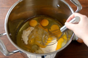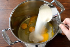 Головним компонентом гоголь-моголя є яйця або яєчні жовтки. Для початку їх потрібно збити. Щоб цей процес був більш простим і ефективним, додайте одну дрібку солі і трохи більше цукру в охолоджені яйця.