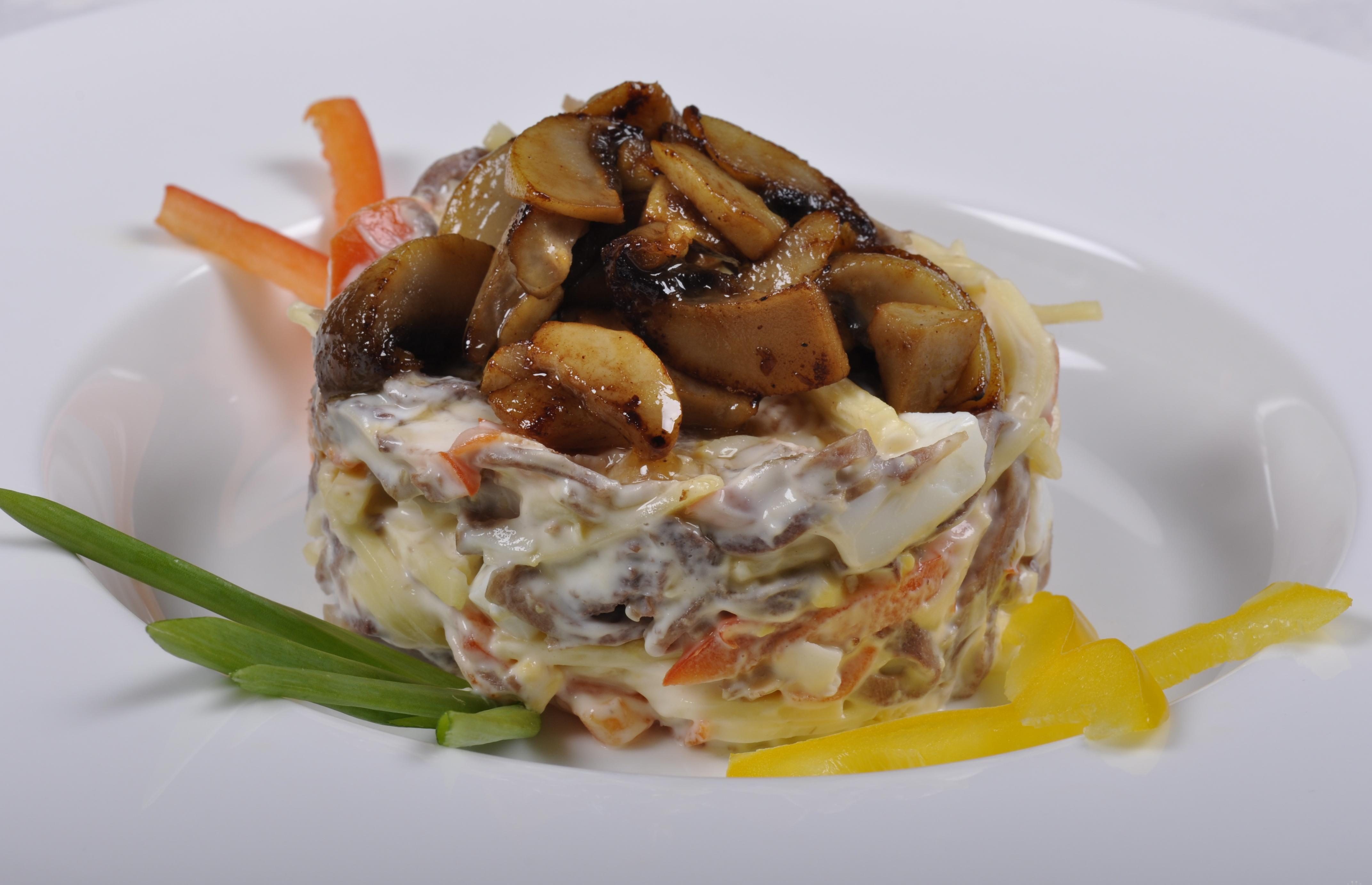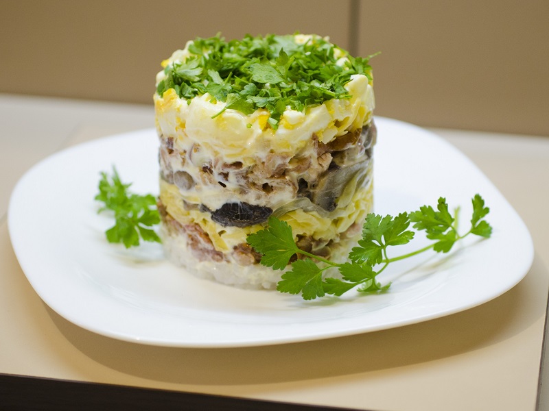 Можна подати салат з печериць, покладений шарами. Таке блюдо буде родзинкою святкового столу.
