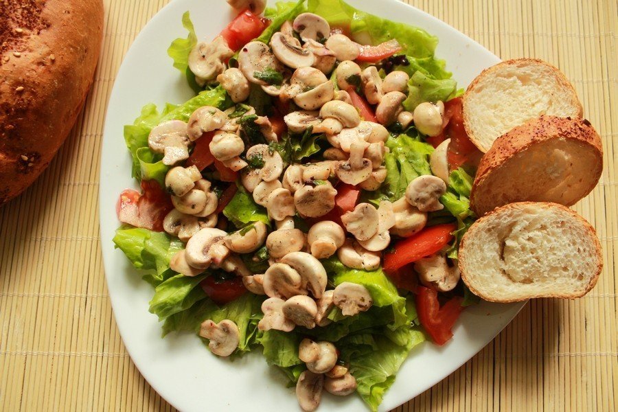 Рецепт легкого салату з свіжих печериць з волоським горіхом без майонезу