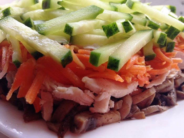 Для приготування закуски потрібен такий продуктовий набір: куряче філе, пара маринованих огірочків, неповний склянку корейської моркви, три яйця, середня цибулина, 200 г маринованих грибів, майонез.