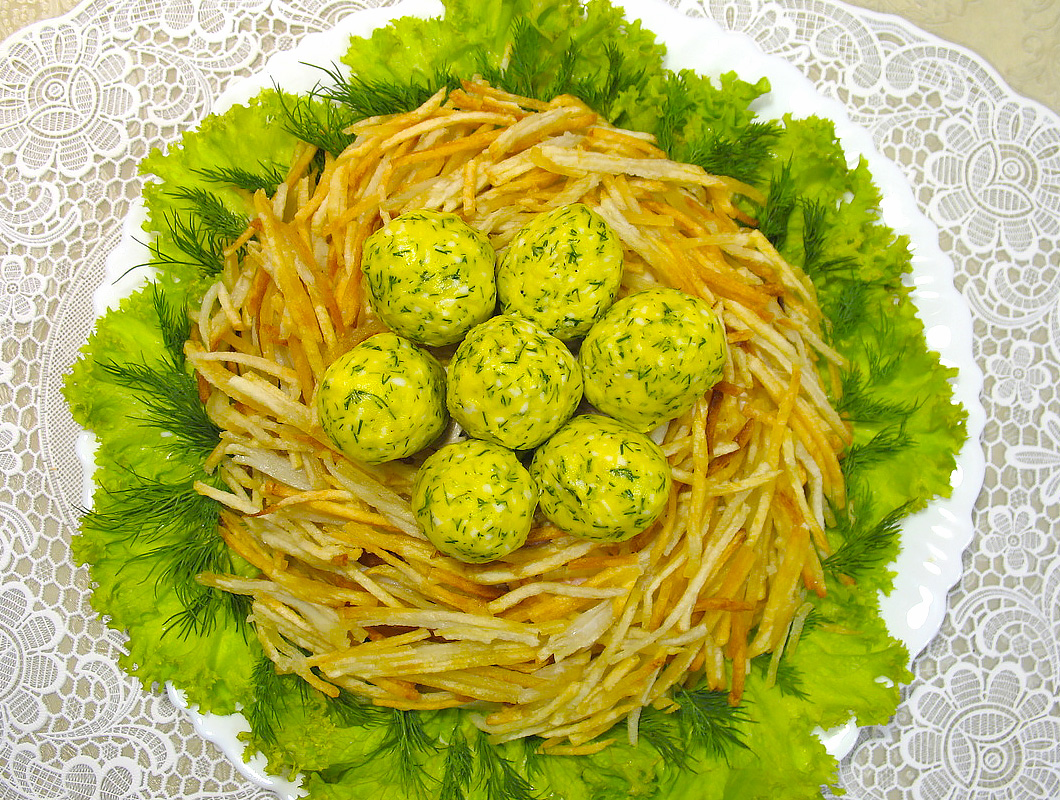 - Салат настоюється в холодильнику пару годин і викладається на блюдо у вигляді гніздечка.