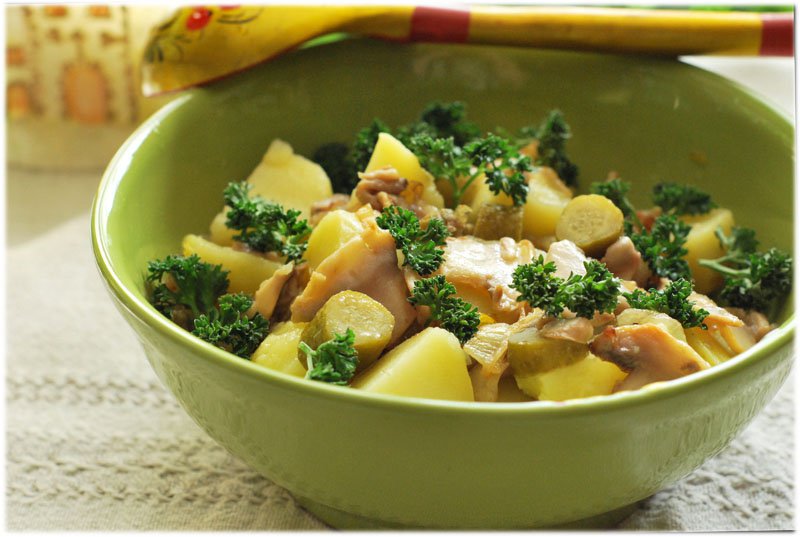 Дієтичний салат підходить для пісного меню. Для нього знадобиться: кілька штук солоних грибів, чотири середніх картоплини, цибулина, свіжий огірок, діжонська гірчиця, зелень, олія, мелений перець, яблучний оцет, зелень.