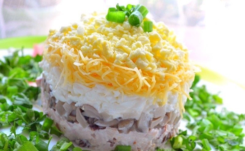 Страви з додаванням морських продуктів легкі і смачні. Дуже незвично виглядає салат з крабовими паличками в співдружності грибів, для якого знадобиться: