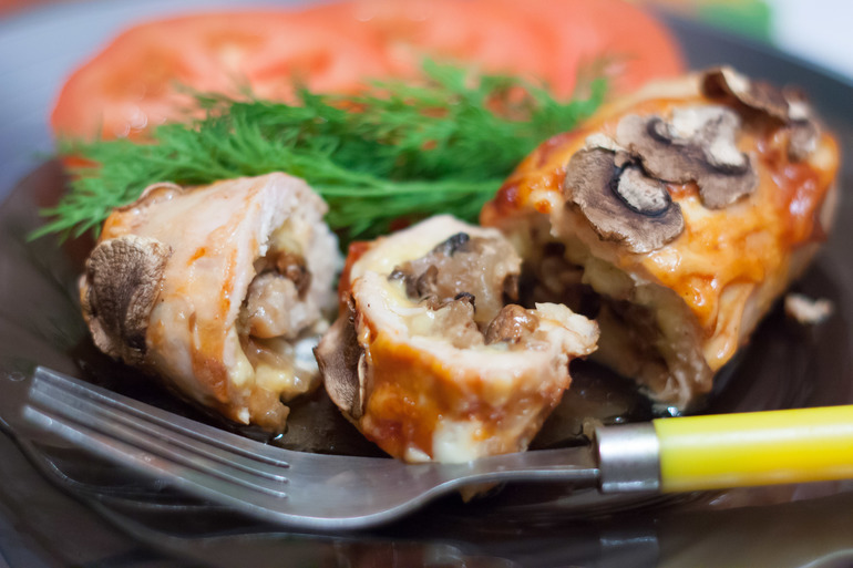Викласти на філе гриби і сир, загорнути їх у вигляді рулетиків і скріпити зубочистками. Обсмажені до золотистого кольору рулети залити молоком з приправами, відправити в духову шафу. Посипати твердим сиром і залишити в розігрітій духовці на десять хвилин.