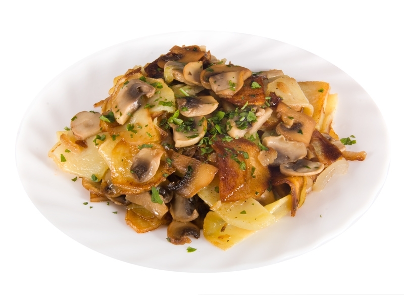 Картоплю очистити від шкірки, нарізати на довільні шматочки. Висипати їх на розпечену сковороду з вершковим маслом. Смажити її близько двадцяти хвилин, а на останніх хвилинах посолити і приправити. У цей час підготувати гриби розрізати на часточки. Плоди цибулі очистити від зайвої шкірки і нарізати на невеликі півкола. Викласти суміш з цибулі і грибів на інший сотейник і обсмажити 15 хвилин. Як тільки цибулина придбає золотавий відтінок, вогонь під стравою можна вимикати.
