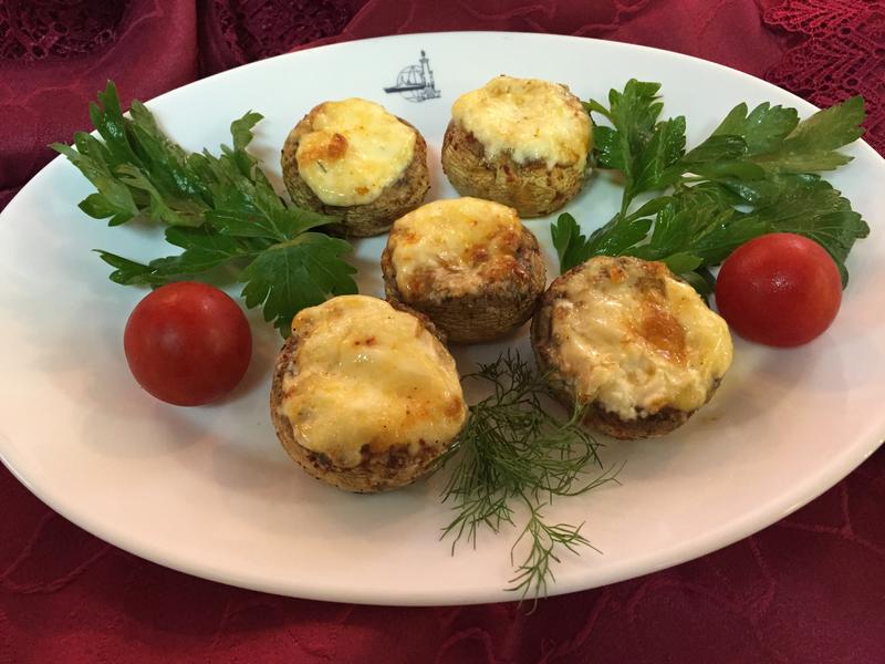 - Капелюшки печериць покласти вниз верхівкою, заправити іншими овочами або часниковим соусом і запікати при невеликій температурі.