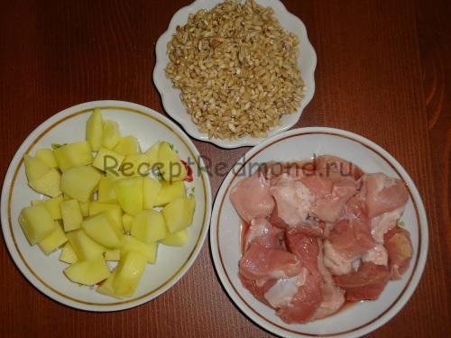 До пассированным овочів додати м’ясо, картоплю, крупу, залити воду, посолити, за бажанням додати спеції. Всі інгредієнти змішати і готувати в режимі «Суп/Варка» 45 хвилин.