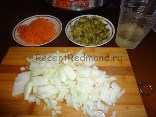 Очищений від шелухилук нарізати дрібними кубиками. Моркву очистити від шкірки, на дрібній тертці натерти для пасерування. Огірки, не знімаючи шкірки, подрібнити на крупній тертці.
