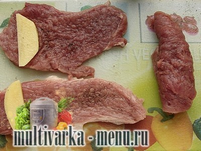 Відбиваємо шматочки м’яса, як на відбивні. Солимо, перчимо. Кладемо брусок картоплі на край шматка. Щільно загортаємо його в рулетик. Картопля теж можна злегка присолити.