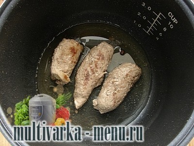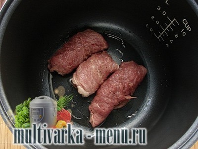 У чашу мультиварки наливаємо невелику кількість масла. Рулетики викладаємо. Краще всього їх відразу зафіксувати зубочистками. До речі, щоб краї зубочисток не заважали перевертати рулетики, можна їх обламати, але потім обов’язково не забути дістати. Можна також рулетики перев’язати ниткою. Після приготування нитку зняти.