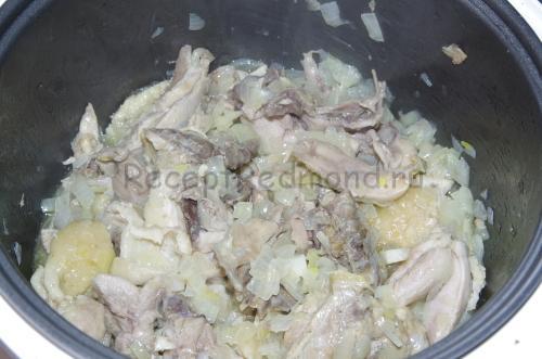 Наріжте порційними шматочками м’ясо і виберіть великі кістки. Разом з дрібно нарізаною цибулею обсмажте його в мультиварці на режимі «смаження» протягом 15 хвилин, щоб цибуля стала золотистого кольору.