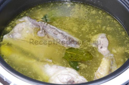 Посоліть воду і відваріть курку в режимі випічка протягом 30 хвилин. Є два способи приготувати м’ясо — розварити його на волокна або звичайною жорсткості. Якщо вас більше влаштовує перший варіант — поваріть м’ясо довше.