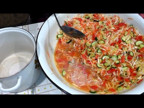 • Ось тепер, коли посуд готова, ставимо каструлю з салатом на вогонь, доводимо його до кипіння і проварюємо хвилин 15. За цей час колір усіх овочів вирівняється. Викладаємо в банки і закатуємо. Банки виставляємо в безпечному місці догори дном. Після того, як салат охолоне, можете його прибирати його в комору.