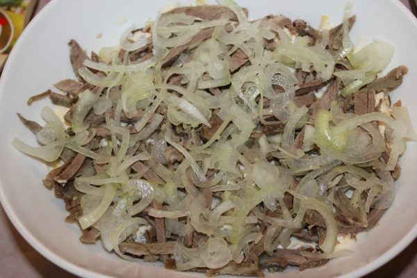 Приготування такої страви, як салат Каприз рецепт з фото продемонструє вам те, що в складі салату знаходиться дуже багато м’яса і цибулі. Представники сильної статі люблять їсти м’ясну їжу у великих кількостях, і в складі цього дуже поживного салату як раз і знаходиться велика кількість м’яса. Крім своєю поживністю, салат ще й дуже корисний, наповнює організм енергією і містить в собі безліч корисних речовин.