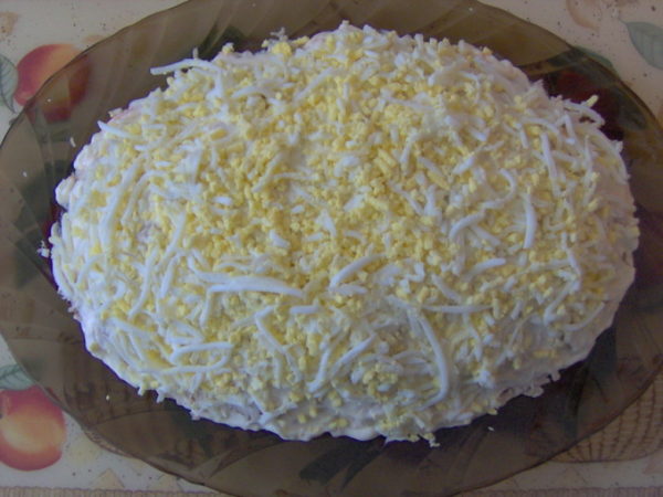 Наступний етап – відварити яйця, охолодити їх і очистити від шкаралупи, а потім натерти на дрібній тертці і подрібнити виделкою.
