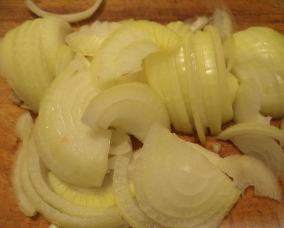 Цибулю потрібно нарізати кільцями або півкільцями, тому, що дрібно нарубаний цибулю для цієї страви є не кращим варіантом.