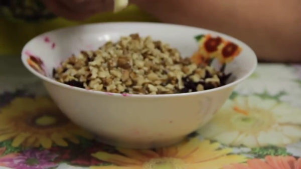 З чорносливом треба буде виконати ті ж дії, що і з родзинками: тобто помити, і, якщо він сухий – замочити, дрібно нарізати. Буряк треба натирати на крупній різанні. Потім змішати з масою з горіхів і чорносливом. Причому частина натертих горіхів відкладіть – потім цю стружку будемо використовувати в якості прикраси салату. Залити майонезом і перемішати.