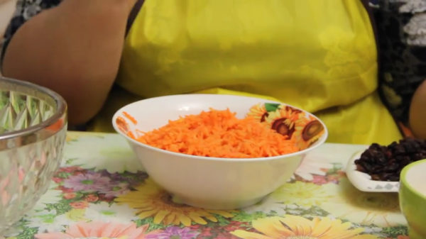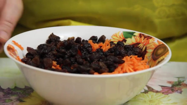 Після того як натерли морквину, беретеся за ізюм. Огляньте його – якщо він надмірно сухий, то змочіть його. Звичайний же родзинки просто помийте і серветкою зітріть краплі води. Потім додайте цей родзинки в морквяну стружку і заправляєте майонезом.
