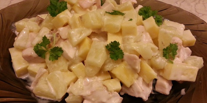 Багато хто не люблять поєднання м’яса з солодким ананасом, помилково вважаючи, що цей фрукт тільки псує смак. Якщо донедавна ви були прихильником такої думки, то зараз настав час розвіяти міф. Спробуйте самі зробити незвичайну закуску по простому покрокового рецептом. Новий салат Наречена з копченою куркою вийде незвичайним: соковитим, легким, смачним, повітряним.