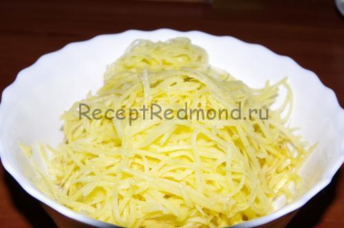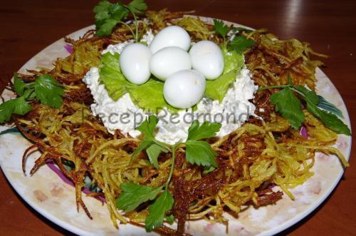 Салат «Перепелине гніздо» — це можливість здивувати креативним блюдом, яке готується нескладно, а ось позитивних (смакових) емоцій воно може викликати море. Мультиварка Редмонд 4505 вам буде чудовим помічником, але без терки для корейської моркви не впоратися. Дві великі картоплини в рецепті нагодують трьох, але, якщо у вас буде інше число що трапезують – беріть з розрахунку: по одній середньої картоплі на людину. Смажити соломку у фритюрі – найнудніша і довга частина цього рецепту, і, якщо час приготування можна скоротити – чому б це не зробити?