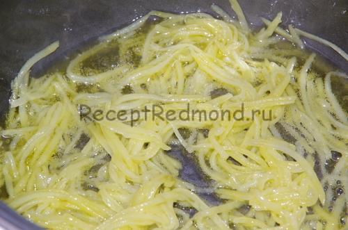 Вмикайте мультиварку на режим «смаження» і чекайте, поки поверхня чаші нагріється. Влийте олію і починайте викладати тонким шаром (або купками) сиру картоплю. Не чіпайте його до тих пір, поки не побачите, що низ гарненько підрум’янився – тільки тоді перевертайте на іншу сторону. Якщо викласти відразу весь картопля – він не обсмажиться, як слід нічого не вийде. В цілому у мене це зайняло 45 хвилин, так як чаша Редмонда 4505 на 3 літри. У кого п’ятилітрова — впораються швидше.