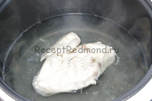 Першим ділом відваріть куряче філе на режимі «випічка» протягом 30 хвилин. Ще 15 хвилин у вас піде на приготування перепелиних яєць.