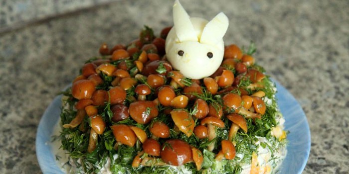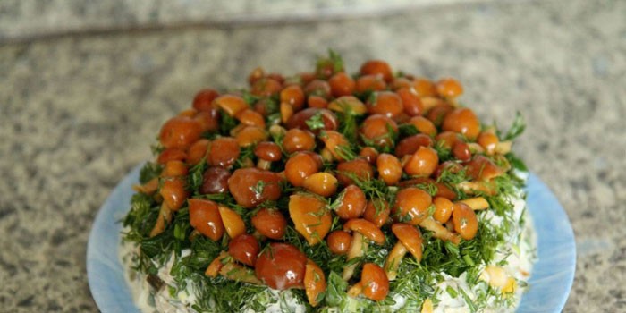Не менш смачним, корисним, виходить ситним варіант, де печериці замінюються іншими видами грибів. Наприклад, дуже святково виглядає салат ” Грибна галявина з опеньками. Крім зовнішнього вигляду, закуска відрізняється пікантним, смаком, який обов’язково оцінять ваші гості. Рецептів існує величезна кількість, нижче представлений один з найбільш швидких і простих.