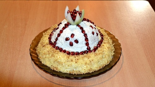 Викладаємо шари з картоплі, моркви, м’яса, буряків, жовтків з горіхами, сиру і білків таким чином, щоб створити ось таку форму шапки Мономаха.