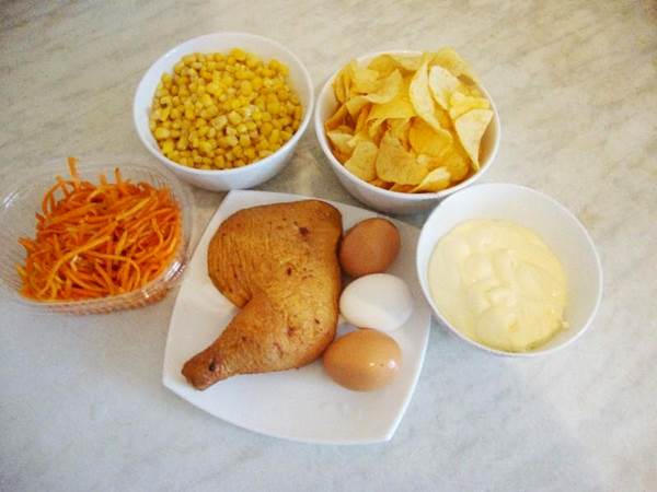 На блюдо викладаємо нарізану курку і змащуємо майонезом. Другим шаром укладається моркву і знову змащується майонезом. Потім йде кукурудза. Варто відзначити, що при бажанні надати салату більш солоний, гострий смак, слід злегка присолити і поперчити саме цей шар. Кукурудзу так само змащуємо майонезом і після посипається подрібненими яйцями. Цей шар є останнім, базовим. Тепер настає черга чіпсів. Перед тим, як починати прикрашати салат чіпсами, яєчний шар так само потрібно змастити майонезом.