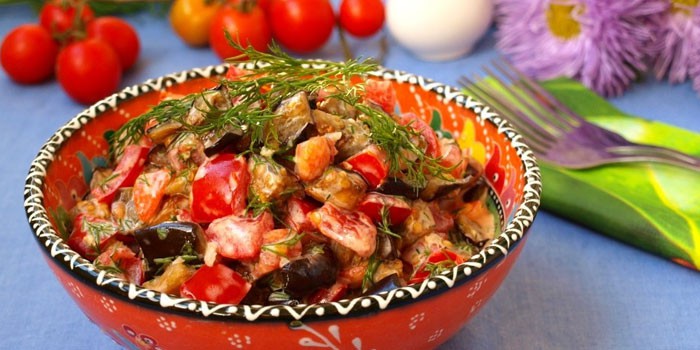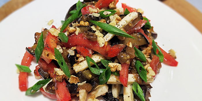 З схожого набору продуктів можна приготувати незвичайне блюдо, яке відрізняється від інших закусок способом подачі – теплий салат з баклажанами, перцем і помідорами. Яскраве, ароматне блюдо з печених овочів відмінно поєднується з картопляним пюре, м’ясними стравами, рибою. Теплий, майже гарячий, цей салат – відмінне рішення для зимового сімейного обіду.