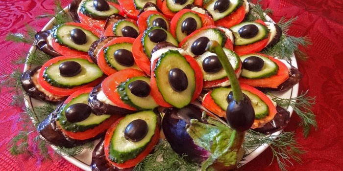 Дивовижна холодна закуска буде описана нижче. Перед тим як приготувати салат Павиний хвіст з баклажанів, розгляньте уважно фото. Прості продукти для нього обов’язково знайдуться у вас вдома. Готують цей салат з запечених баклажанів, які начиняють сиром, декорують огірком і маслиною. Страва готується просто, виходить смачним і дуже красивим.