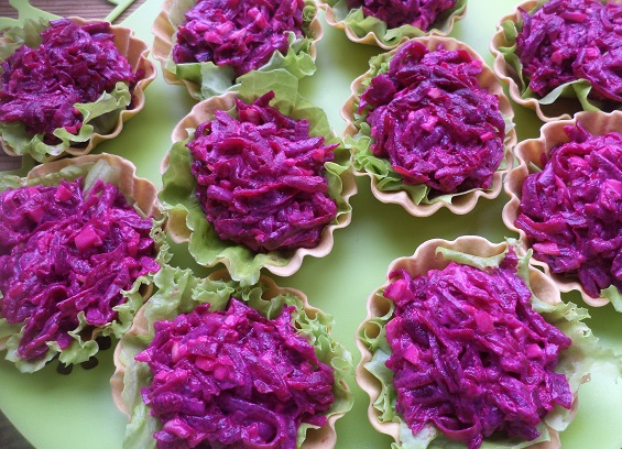 Це відмінний варіант салату з буряка з часником і чорносливом в тарталетках.