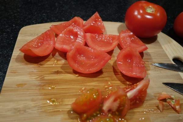 При обробці помідора потрібно відокремити м’якоть від нутрощів з насінням. Нарізати тільки м’якоть на маленькі шматочки, внутрішня частина помідорів з насінням для цього салату вам зовсім не потрібна.
