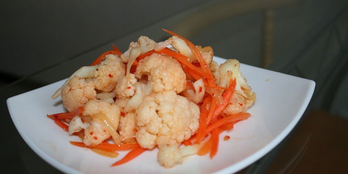 Гострим пряним смаком відрізняється салат з цвітної капусти по-корейськи, який добре поєднується з смаженою на грилі м’ясом чи шашликами. Його зручно брати з собою на природу, перекушувати на дачі. Секрет правильного приготування в тривалому маринуванні – протягом 4-5 годин овочі настоюються в заправці, купуючи багатогранний смак і пряний аромат.