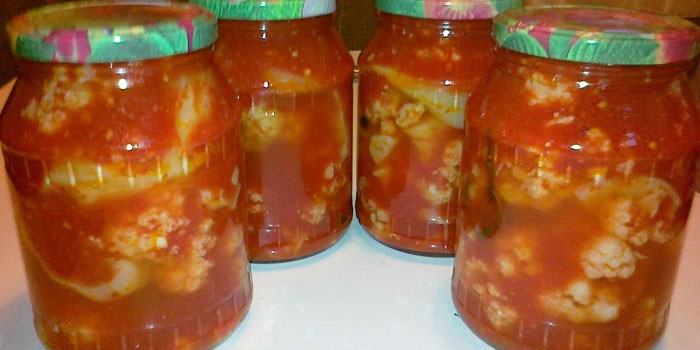 Смачний вітамінний салат з цвітної капусти на зиму виходить при поєднанні цього овоча з помідорами і морквою. Готувати його швидко і легко, а насолоджуватися смаком в холодну пору року будуть всі домочадці. Добре подавати разносол з відварною або смаженою картоплею, м’ясних і рибних виробом, до курки або індички. Тонкий пікантний смак відрізняє заготовку.