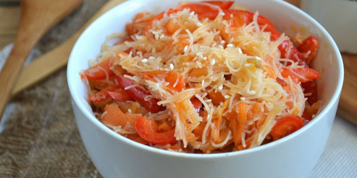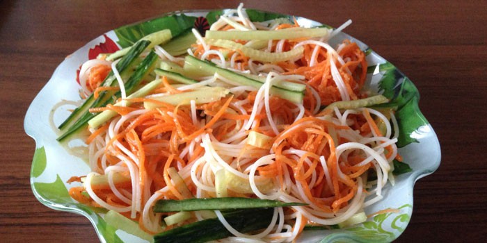 Один з важливих елементів азіатської кухні – корейська морквина. Вона використовується в безлічі страв, салати з фунчозы – не виняток. Смак виходить незвичайний, але дуже приємний. Морква надає локшині кислинку і гостринку, що не може не радувати прихильників східної кулінарії. Тим більше, що страва готується швидко, буквально за 15 хвилин, тому будь-яка господиня зможе здивувати домочадців спонтанним і смачною вечерею. Фунчоза з морквою по-корейськи робиться так.