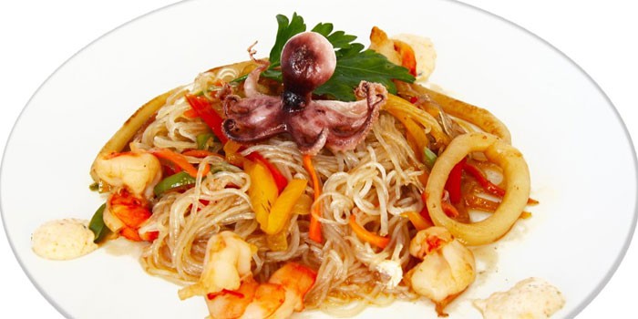 Ще один компонент, яким можна урізноманітнити салат з крохмальної локшини – морепродукти. Вийде легке і дуже корисна страва з великою кількістю вітамінів. Підійде салат як для святкових столів, так як раціону на кожен день. Салат з фунчозой і морепродуктів (можна використовувати будь-які: крабове м’ясо, мідії, кальмари, креветки та ін) готується швидко і просто.