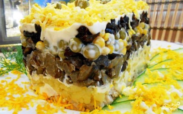 Візьмемо блюдо і викладемо салат шарами: картоплю, курку, гриби з цибулею, горошок, кукурудзу, чорнослив, яйця. Кожен шар покриваємо майонезом. Даємо салату трохи охолонути та дивувати гостей його оригінальним смаком.