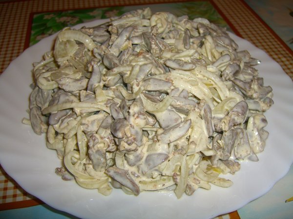 Готуючи салат курячі сердечка відварюємо і нарізаємо соломкою.