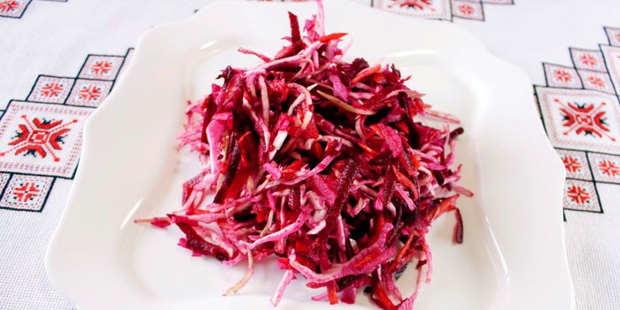 Готову страву на основі цього покрокового рецепту з легкістю доведе, що корисне буває ще красивим і апетитним. Оригінальний овочевий салат, буряк, морква, капуста, які практично завжди є під рукою, не вимагають особливих вмінь в приготуванні і неймовірно корисні. Подаючи до столу таку овочеву закуску, вийде легко поповнити запас вітамінів в організмі, які необхідні йому для збереження молодості.