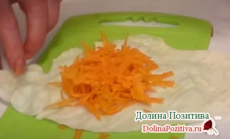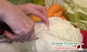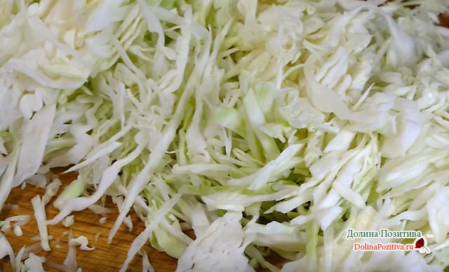 Нашаткуйте капусту. Качан попередньо очистіть від верхніх листків, помийте, обітріть. Зріжте з кочережки шматки. Искрошите тонкою соломкою.