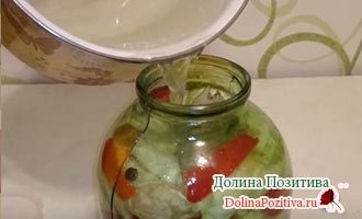 Дайте маринаду 5 хвилин покипіти. Залийте в банку тонкою цівкою. Прикрийте кришкою. Через 15-20 хвилин долийте маринаду до повної банки.